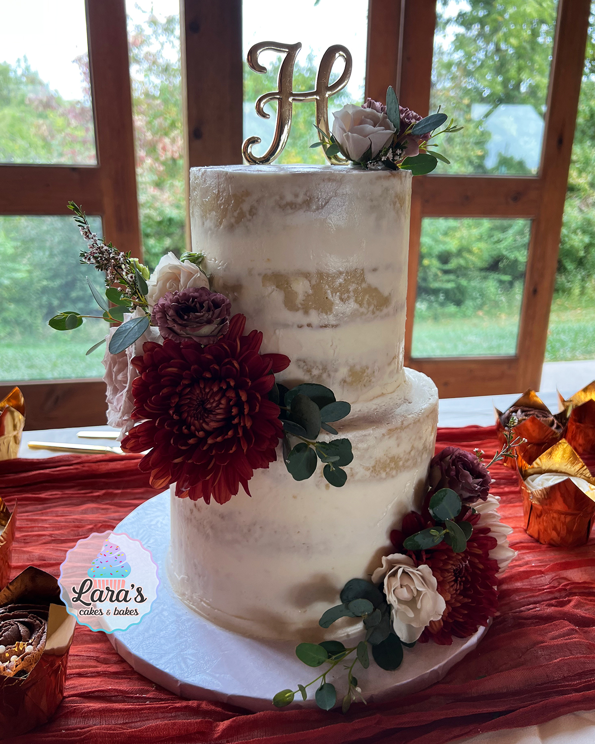 Two-Tiered Chocolate and Caramel Cake with gold and flowers
